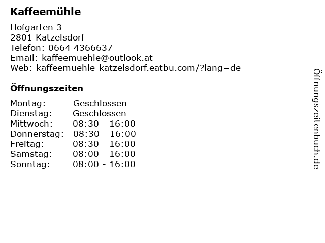| Öffnungszeiten Kaffeemühle in Katzelsdorf anzeigen | |