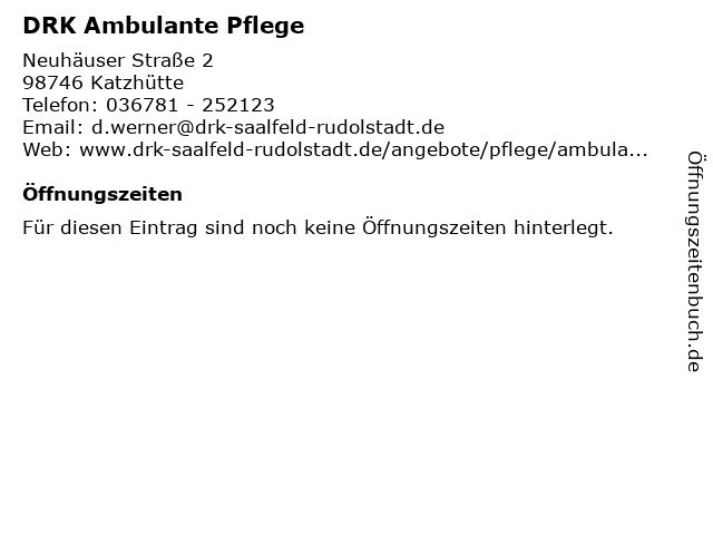 | Öffnungszeiten DRK Ambulante Pflege in Katzhütte anzeigen | |