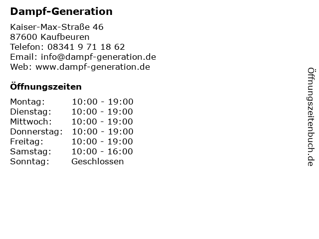 | Öffnungszeiten Dampf-Generation in Kaufbeuren anzeigen | |