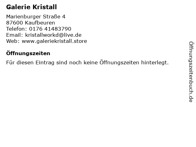 | Öffnungszeiten Galerie Kristall in Kaufbeuren anzeigen | |