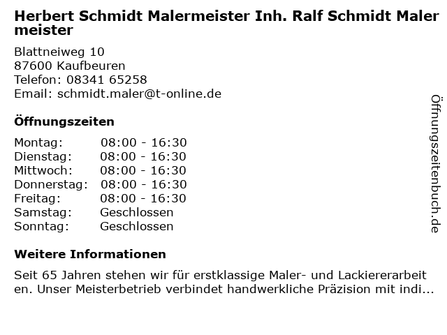 Branchen & Suchbegriffe zu Herbert Schmidt Malermeister Inh. Ralf Schmidt Malermeister:herbert, malermeister, ralf, schmidt |