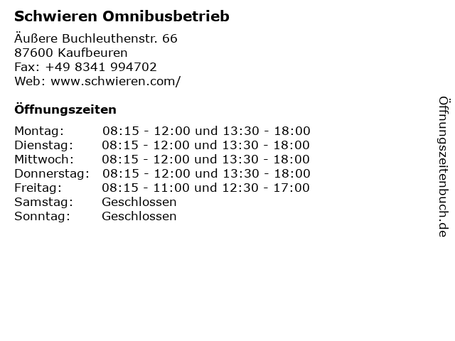| Öffnungszeiten Schwieren Omnibusbetrieb in Kaufbeuren anzeigen | |
