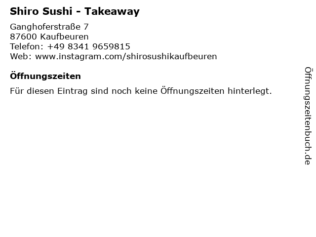 | Öffnungszeiten Shiro Sushi - Takeaway in Kaufbeuren anzeigen | |