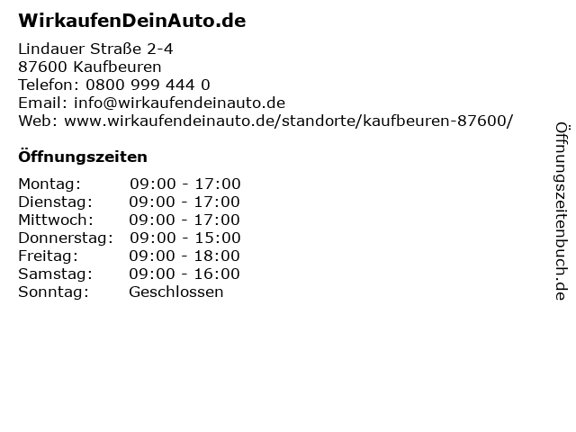 | Öffnungszeiten WirkaufenDeinAuto.de in Kaufbeuren anzeigen | |