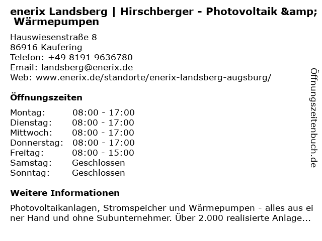 1 Hirschberger Alternative Energietechnik GmbH & Co KG (Entfernung: 0,00 km) Hauswiesenstr. 8, 86916 Kaufering 2 enerix Landsberg - Augsburg - Photovoltaik & Stromspeicher (Entfernung: 3,55 km) Celsiusstr. 15, 86899 Landsberg 5 Photovoltaik - Elektromeisterbetrieb seit über 20 Jahren (Entfernung: 15,87 km) Fuggerstr. 15, 86511 Schmiechen 6 |