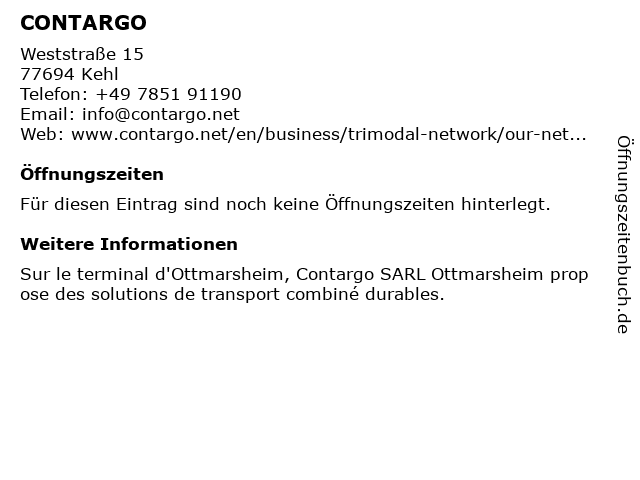 | Öffnungszeiten CONTARGO in Kehl anzeigen | |