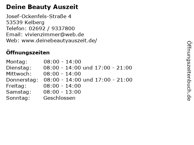 | Öffnungszeiten Deine Beauty Auszeit in Kelberg anzeigen | |