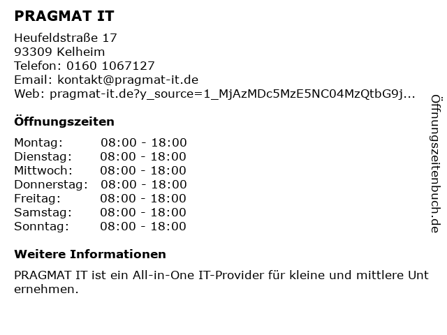 | Öffnungszeiten PRAGMAT IT in Kelheim anzeigen | |