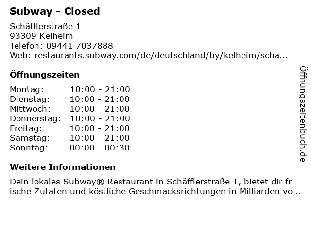 | Öffnungszeiten Subway - Closed in Kelheim anzeigen | |