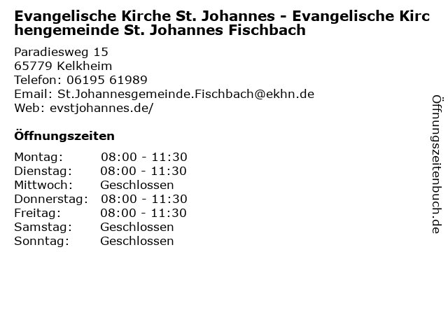 1 Evangelische Kirchengemeinde St. Johannes Fischbach Gemeindebüro (Entfernung: 0,02 km) Paradiesweg 17, 65779 Kelkheim 2 Evangelische Pfarramt der Johannesgemeinde, Pfarrer Friedemann vom Dahl (Entfernung: 6,82 km) Kurhausstr. 43 A, 65719 Hofheim 3 Evangelische Kindertagesstätte Kunterbunt (Entfernung: 9,55 km) Kastanienstr. 2a, 65719 Hofheim am Taunus 6 |
