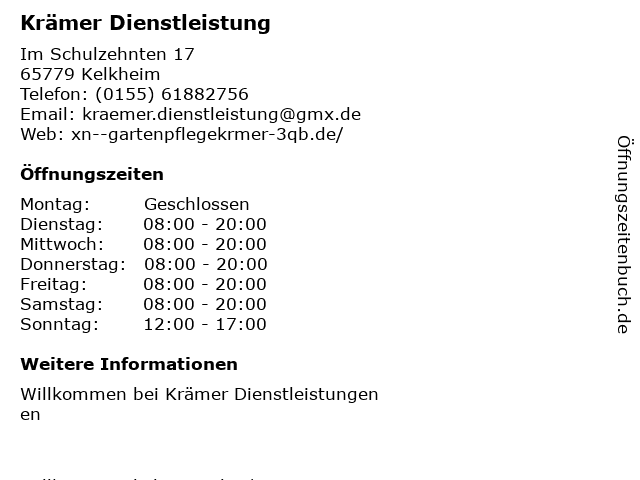 | Öffnungszeiten Krämer Dienstleistung in Kelkheim anzeigen | |