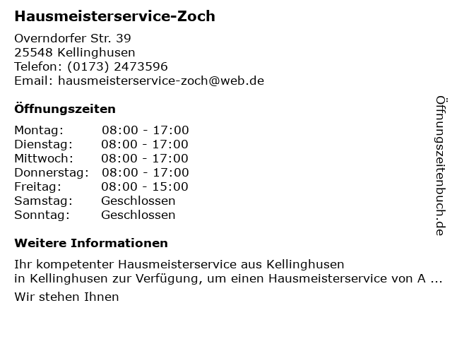 | Öffnungszeiten Hausmeisterservice-Zoch in Kellinghusen anzeigen | |