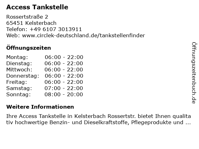 | Öffnungszeiten Access Tankstelle in Kelsterbach anzeigen | |