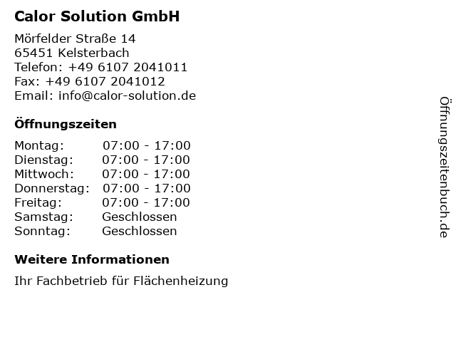 | Öffnungszeiten Calor Solution GmbH in Kelsterbach anzeigen | |