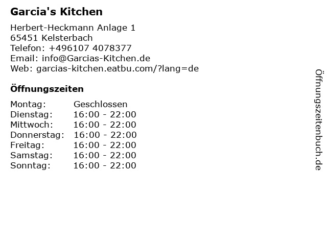 | Öffnungszeiten Garcia's Kitchen in Kelsterbach anzeigen | |