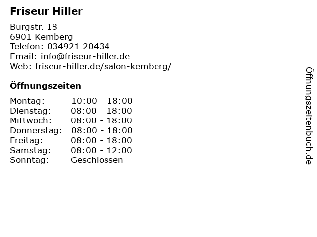 | Öffnungszeiten Friseur Hiller in Kemberg anzeigen | |