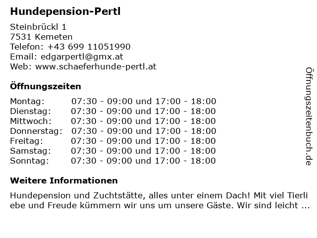 | Öffnungszeiten Hundepension-Pertl in Kemeten anzeigen | |