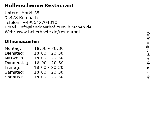 | Öffnungszeiten Hollerscheune Restaurant in Kemnath anzeigen | |