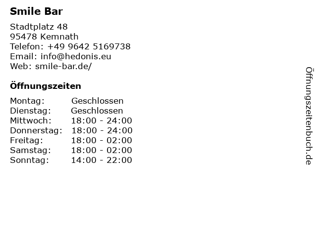 | Öffnungszeiten Smile Bar in Kemnath anzeigen | |