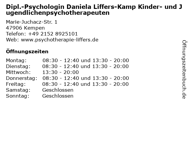 Branchen & Suchbegriffe zu Dipl.-Psychologin Daniela Liffers-Kamp Kinder- und Jugendlichenpsychotherapeuten:daniela, dipl., jugendlichenpsychotherapeuten, kamp, kinder, liffers, psychologe, psychologin |