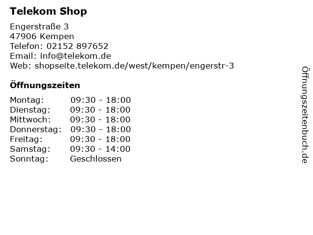 | Öffnungszeiten Telekom Shop in Kempen anzeigen | |