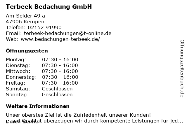 | Öffnungszeiten Terbeek Bedachung GmbH in Kempen anzeigen | |