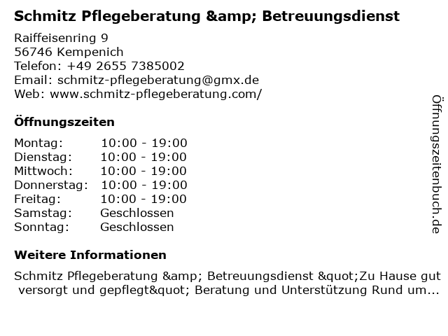 | Branchen & Suchbegriffe zu Schmitz Pflegeberatung & Betreuungsdienst:betreuungsdienst, pflegeberatung, pflegekurse, pflegeschulungen, schmitz, überleitungspflege |
