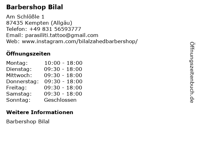 | Öffnungszeiten Barbershop Bilal in Kempten (Allgäu) anzeigen | |