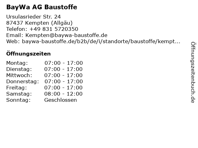 | Öffnungszeiten BayWa AG Baustoffe in Kempten (Allgäu) anzeigen | |
