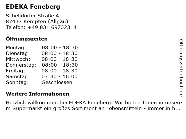 | Öffnungszeiten EDEKA Feneberg in Kempten (Allgäu) anzeigen | |