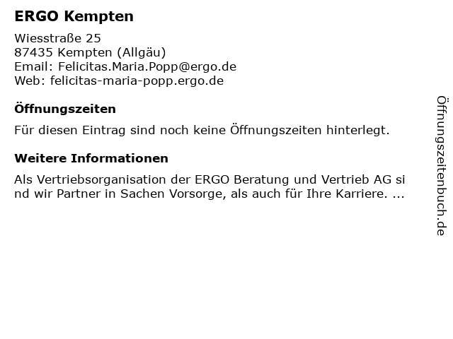 | Öffnungszeiten ERGO Kempten in Kempten (Allgäu) anzeigen | |
