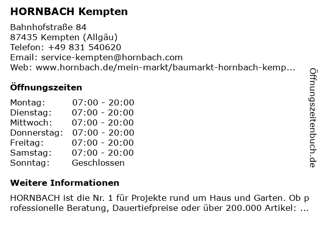 | Öffnungszeiten HORNBACH Kempten in Kempten (Allgäu) anzeigen | |