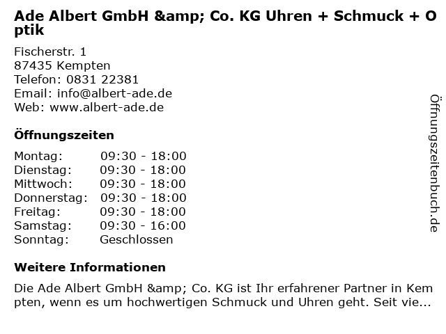Branchen & Suchbegriffe zu Ade Albert GmbH & Co. KG Uhren + Schmuck + Optik:ade, albert, optik, schmuck, uhren |