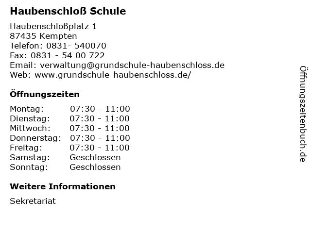 | Öffnungszeiten Haubenschloß Schule in Kempten anzeigen | |