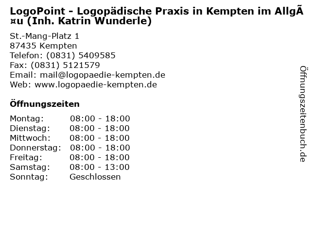 Branchen & Suchbegriffe zu LogoPoint - Logopädische Praxis in Kempten im Allgäu (Inh. Katrin Wunderle):allgäu, katrin, logopoint, logopädische, praxis, wunderle, wunderle) |