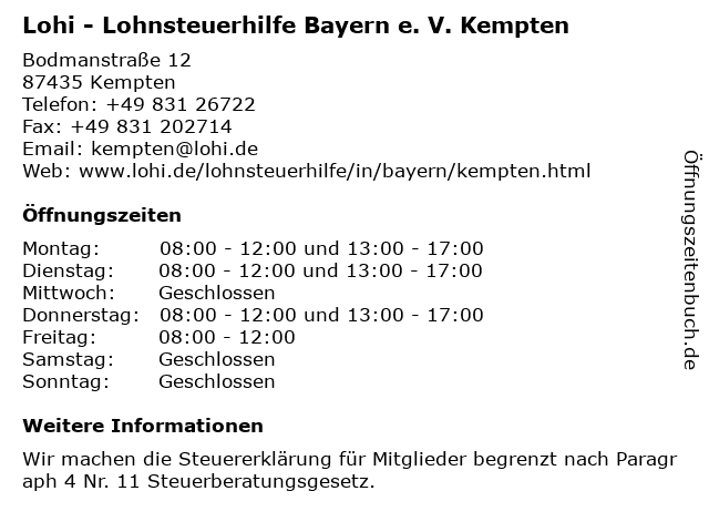 Branchen & Suchbegriffe zu Lohi - Lohnsteuerhilfe Bayern e. V. Kempten:arbeitnehmersteuerberatung, bayern, e., einkommensteuer, einkommensteuererklärung, lohi, lohnsteuerhilfe, lohnsteuerhilfeverein, lohnsteuerjahresausgleich, steuerbescheid, steuererklärung, steuerformular, v. |