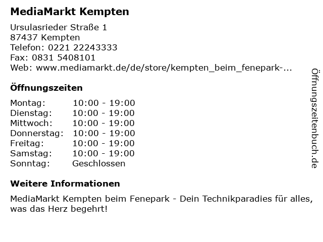 | Öffnungszeiten MediaMarkt Kempten in Kempten anzeigen | |