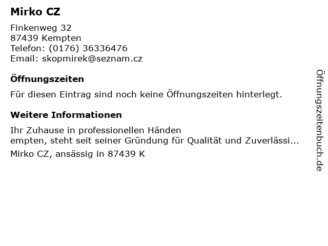 | Öffnungszeiten Mirko CZ in Kempten anzeigen | |
