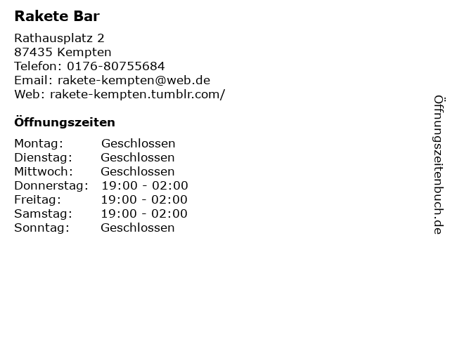 | Öffnungszeiten Rakete Bar in Kempten anzeigen | |