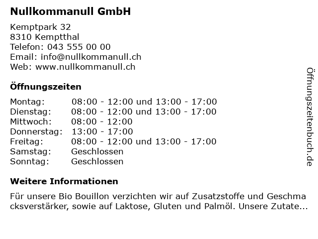 | Öffnungszeiten Nullkommanull GmbH in Kemptthal anzeigen | |