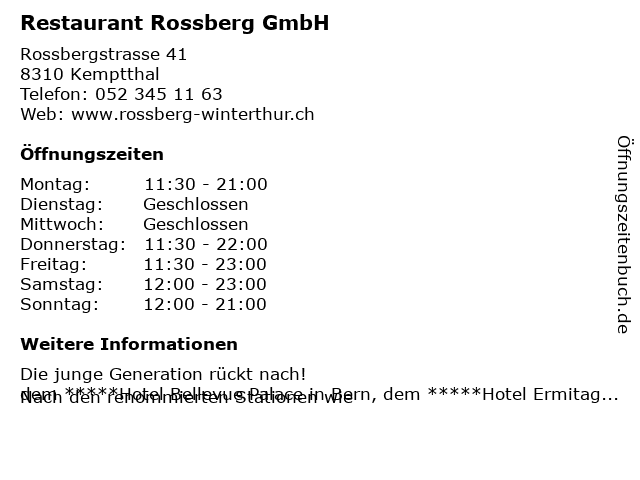| Öffnungszeiten Restaurant Rossberg GmbH in Kemptthal anzeigen | |