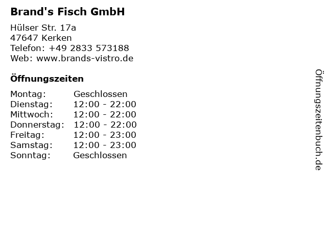 | Öffnungszeiten Brand's Fisch GmbH in Kerken anzeigen | |