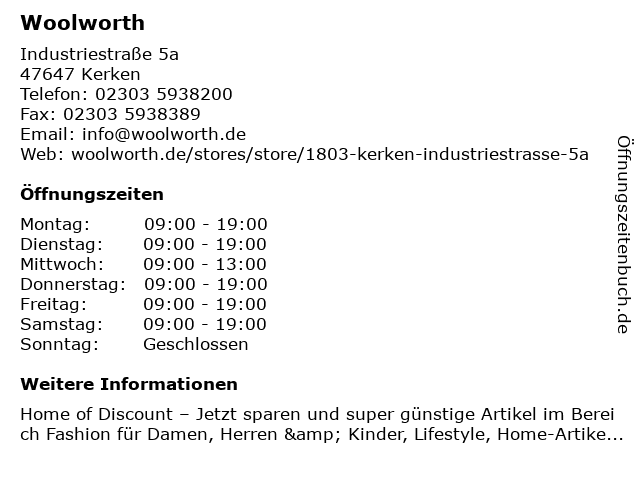 | Öffnungszeiten Woolworth in Kerken anzeigen | |