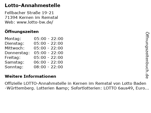| Öffnungszeiten Lotto-Annahmestelle in Kernen im Remstal anzeigen | |