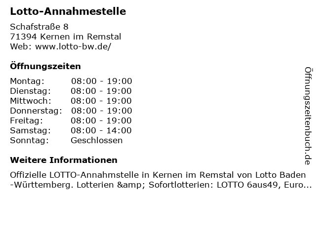 | Öffnungszeiten Lotto-Annahmestelle in Kernen im Remstal anzeigen | |