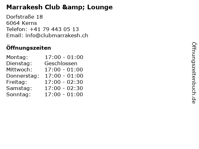 | Öffnungszeiten Marrakesh Club & Lounge in Kerns anzeigen | |