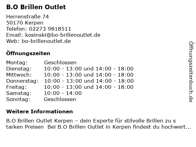 | Öffnungszeiten B.O Brillen Outlet in Kerpen anzeigen | |