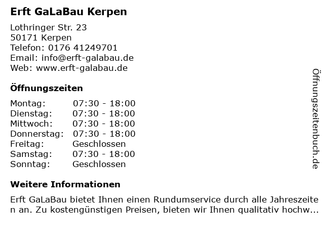 | Öffnungszeiten Erft GaLaBau Kerpen in Kerpen anzeigen | |
