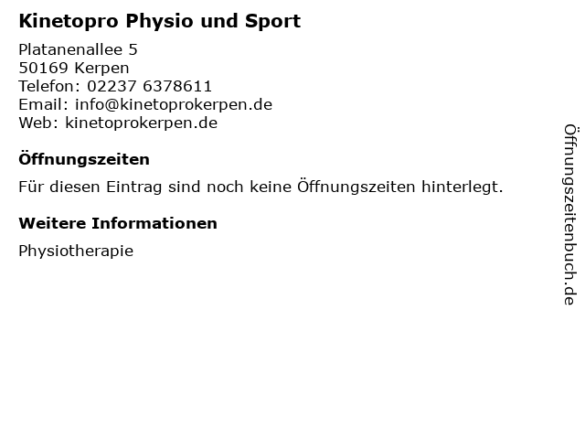| Öffnungszeiten Kinetopro Physio und Sport in Kerpen anzeigen | |
