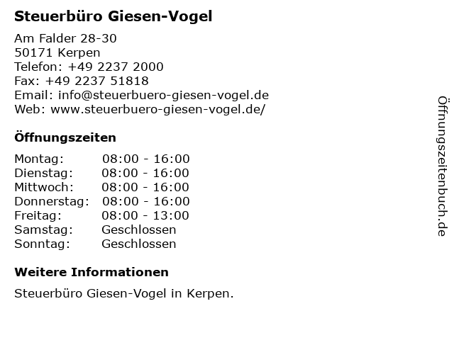 | Öffnungszeiten Steuerbüro Giesen-Vogel in Kerpen anzeigen | |